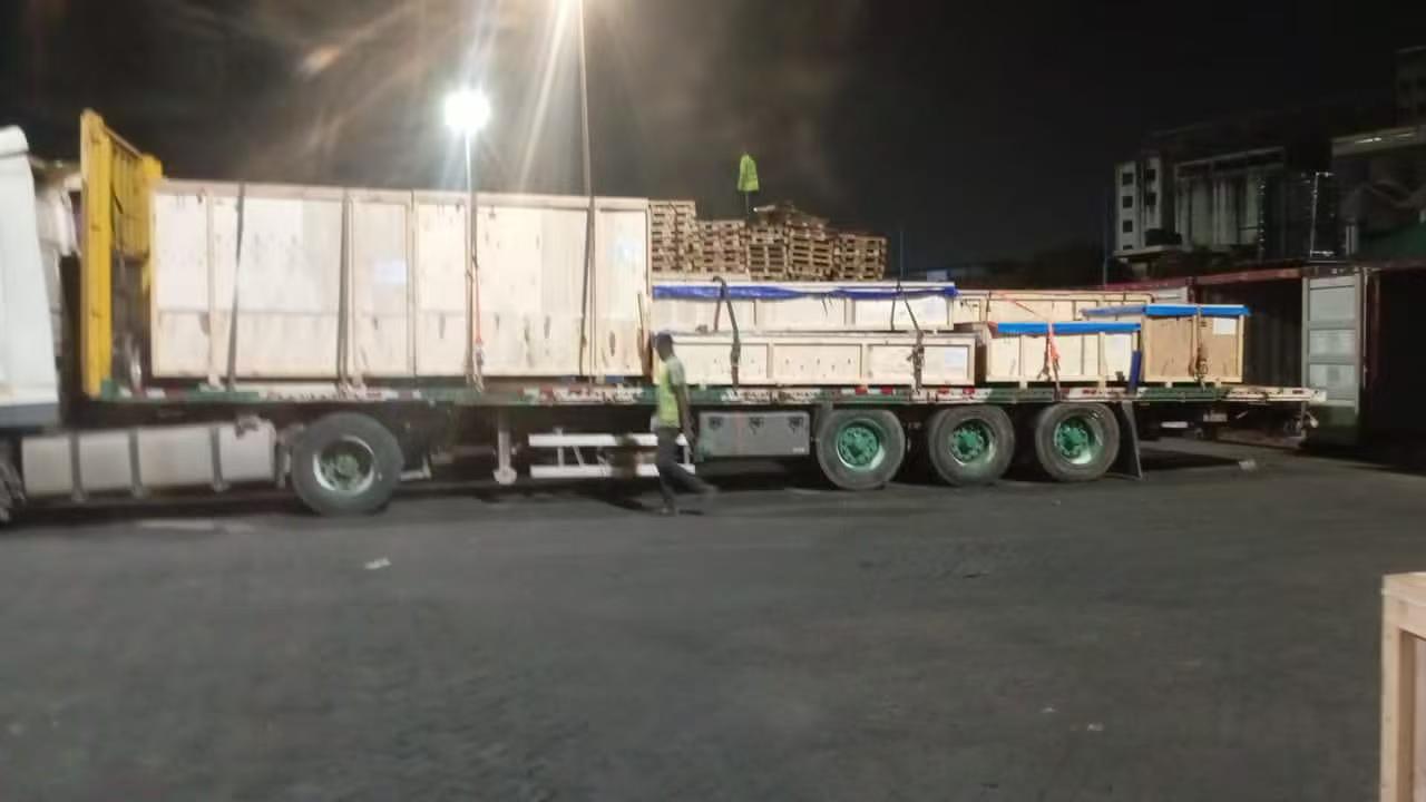 Após a chegada da mercadoria ao Porto de Tema, em Gana, nosso a equipe profissional concluiu o recebimento e a inspeção prontamente. Para grande potência equipamento, realizamos amarração e reforço em todo o processo para evitar deslocamento durante o transporte terrestre. Todas as mercadorias foram totalmente cobertas com lonas laminadas à prova d'água para resistir às intempéries e aos danos causados pela umidade. Cada veículo de transporte foi equipado com um formulário de recebimento padrão para rastreabilidade e verificação de todo o processo.